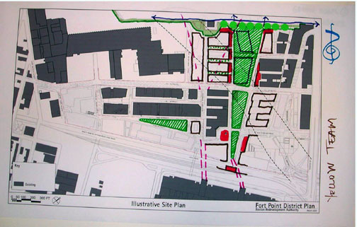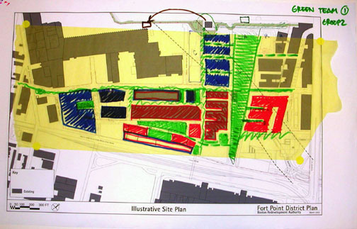 June 2005Shown: The Boston Redevelopment Authority greenspace plan for Fort Point 100 Acres, resulting from 45 BRA-hosted planning meetings of the Fort Point Working Group and Fort Point Advisory Committee, a six hour Fort Point Community Open Planning Charrette hosted by the BRA in February 2004, and a year (Summer '04 - Summer '05) of private negotiations between the BRA and large-property owners.