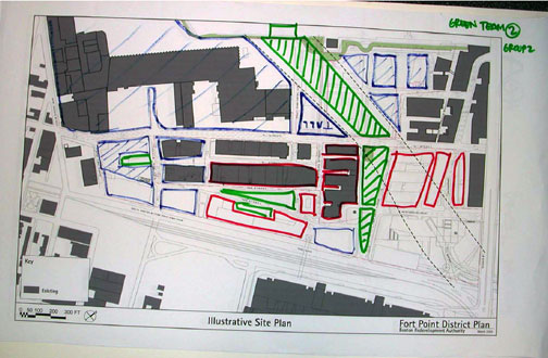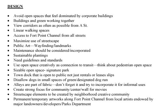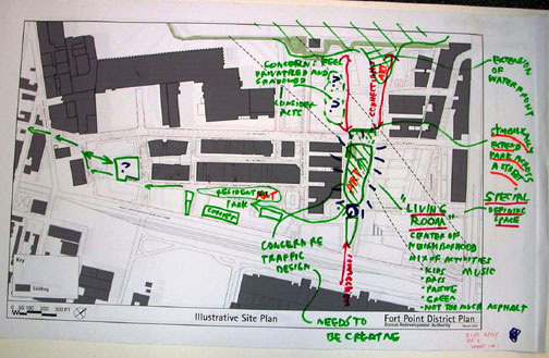 Shown below: BRA notes from Fort Point Community Open Space Charrette of 2004