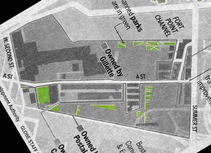Shown: The Gillette/USPS plan as adopted by the BRA, presented in 2002 to the newly formed Fort Point Advisory Committee after 20+ meetings of the Fort Point Working Group.