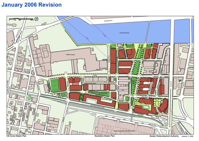 On Tuesday, January 17, 2006, at a public meeting of the Fort Point Advisory Committee, the Boston Redevelopment Authority presented a modified 100-Acre plan including community's proposed recreational park parcel in the heart of the District, thereby providing a greenspace with public access to the Fort Point Channel. Developing story...click here to view enlargement
