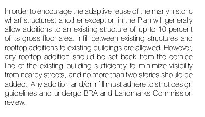 No public discussion regarded such support for multi-story additions on historic structures. On the contrary, the BRA has emphasized in public planning presentations over the past decade that such additions would be discouraged.