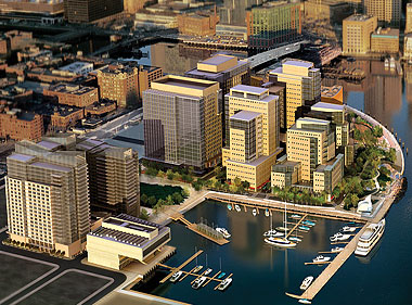 On the website of Fan Pier developer The Fallon Company, a marina is proposed in the bay directly in front of ICA Media Center window. The proposed marina can be seen in the above rendering, in front of the ICA.