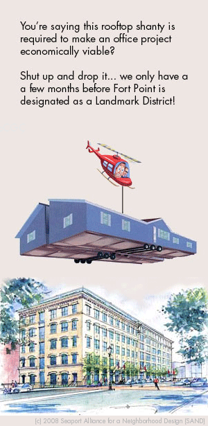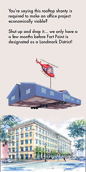 At that time , the BRA informed the Fort Point community that by approving a variance for a rooftop addition, the residential project would be viable in a strong office market. Lincoln Property's rooftop addition will be visible along the entire length of Summer Street, from the Summer Street bridge to the Convention Center and beyond.